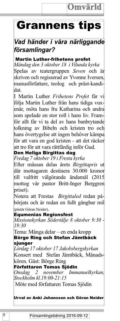 Artiklar ur församlingstidningen, hösten 2016