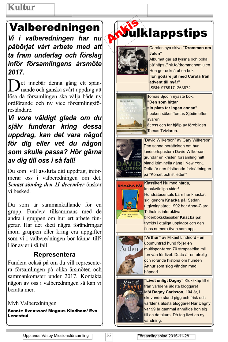 Artiklar ur församlingstidningen, vintern 2016-2017